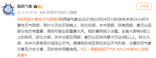 预计今天白天到晚上,陕北东部、关中西部、陕南西部、秦巴山区部分地方有雷暴,局地可能出现雷暴大风、短时暴雨或小冰雹。全省大部有6级以上的阵风,陕北大部、关中大部有扬沙或浮尘天气。提请相关地区密切关注天气形势,注意防范气象灾害及次生灾害,及时发布预警信号。