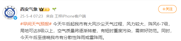 今天午后起西安市有大风沙尘天气过程,风力较大,阵风6-7级,局地可达8级以上,空气质量将逐渐转差,有短时重度污染,需做好防范。同时,今天午后至傍晚西安市有分散性阵雨或雷阵雨。